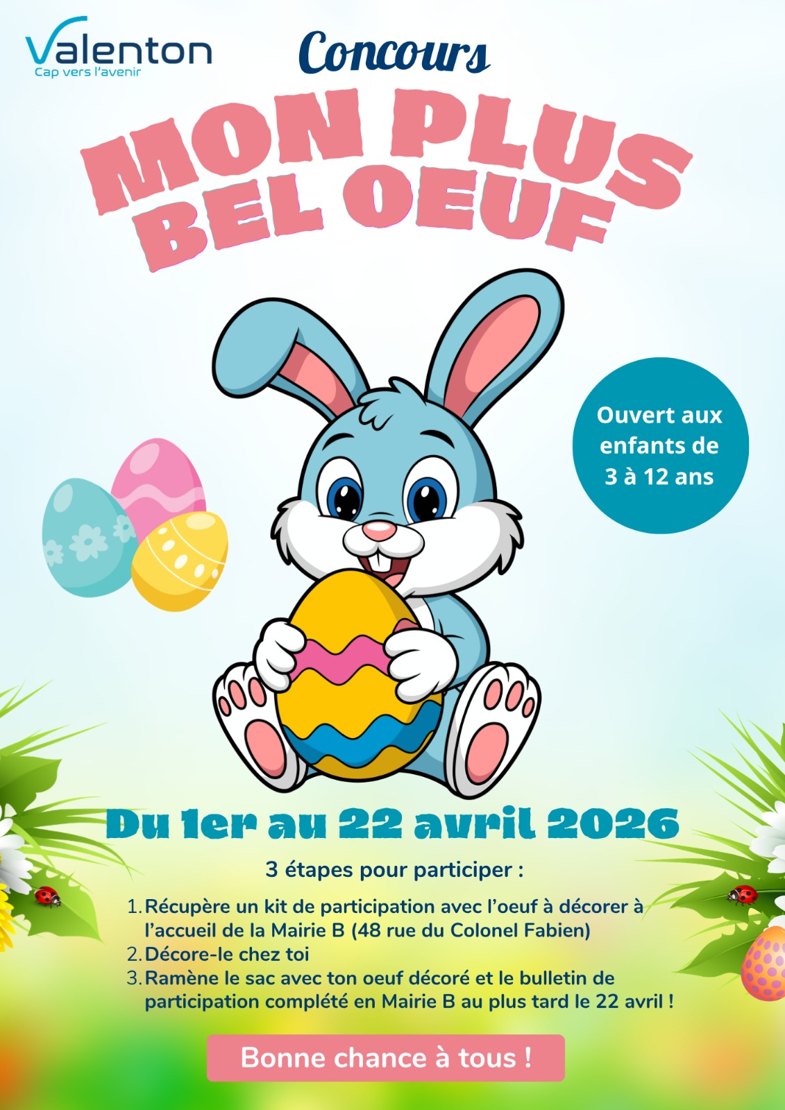 - Ramène ton œuf décoré et ton bulletin de participation rempli en Mairie B avant le mercredi 22 avril !